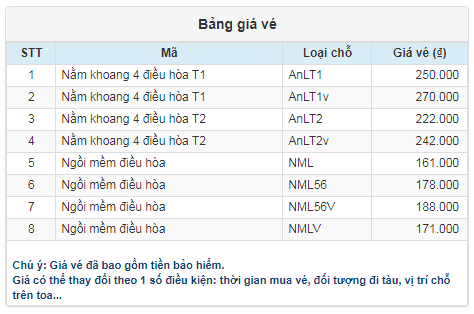 Giá vé tàu khá đa dạng, dao động từ 135.000 đồng đến 432.000 đồng tùy loại ghế và thời điểm đặt vé. Nếu bạn muốn tìm một lựa chọn tiết kiệm, vé một chiều có thể chỉ từ 166.000 đồng, trong khi vé khứ hồi có giá từ 311.000 đồng. Điều này giúp hành khách có nhiều sự lựa chọn phù hợp với ngân sách của mình.