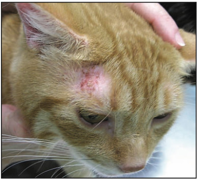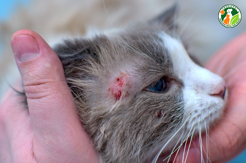 Quan sát kỹ hơn, da mèo có thể nổi mụn trứng cá quanh cằm, hoặc sưng đỏ kèm mụn li ti, thậm chí loét rộng ở mũi, môi. Nếu kèm mùi hôi ẩm mốc, có thể do nấm men gây da dày sần, tiết bã nhờn.