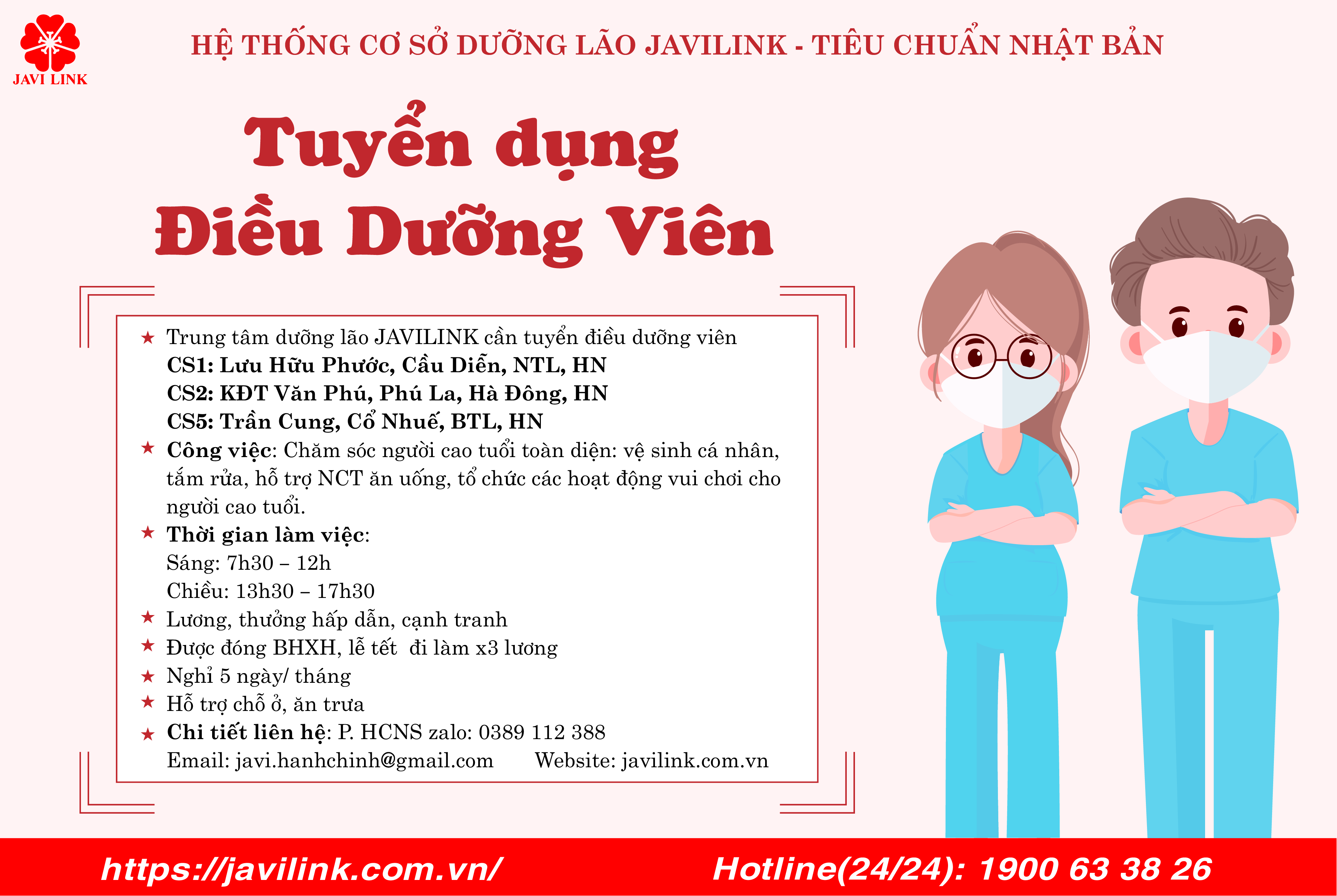 Bên cạnh đó, tất cả nhân viên đều được đóng bảo hiểm, nghỉ phép có lương và tham gia các khóa đào tạo nâng cao chuyên môn. Nếu bạn có đam mê và trách nhiệm trong lĩnh vực chăm sóc sức khỏe, hãy gia nhập đội ngũ của chúng tôi để cùng nhau chăm sóc những người đã có nhiều cống hiến cho xã hội.