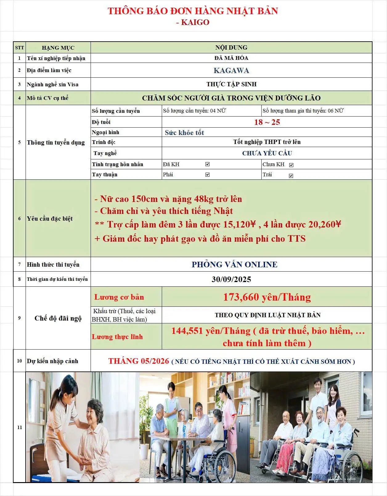 Chúng tôi cần những ứng viên đã tốt nghiệp Trung cấp trở lên trong các chuyên ngành liên quan, cùng với kỹ năng chăm sóc sức khỏe chuyên nghiệp. Kỹ năng giao tiếp tốt sẽ là một lợi thế lớn giúp bạn kết nối với các cụ ông cụ bà và gia đình của họ. Lương từ 11 triệu đến 13 triệu đồng cùng với nhiều chế độ đãi ngộ hấp dẫn như bảo hiểm và nghỉ phép có lương sẽ được cung cấp cho nhân viên làm việc tại đây.