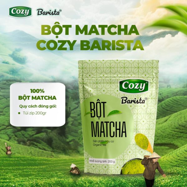 Bột trà xanh matcha tại đây được sản xuất từ những búp trà chất lượng cao, theo tiêu chuẩn VietGap. Đặc biệt, bột Matcha Cozy Barista còn được chế biến từ 70% lá trà non và 30% búp trà, giúp tạo ra một nguyên liệu tự nhiên và an toàn cho sức khỏe. Bạn có thể sử dụng bột matcha để pha trà sữa ngon, làm bánh hoặc thậm chí là chế biến các công thức làm đẹp cho da.