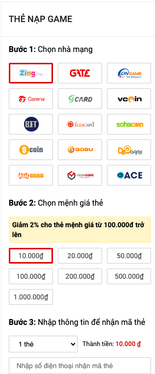 Phương thức thanh toán cũng rất linh hoạt, từ việc thanh toán bằng tiền mặt, thẻ ATM cho đến việc chuyển khoản. Nếu bạn thích thẻ Zing, hiện nay nhà phát hành VNG đã cho ra mắt cả thẻ cào giấy lẫn thẻ điện tử với nhiều mệnh giá khác nhau, giúp người chơi dễ dàng lựa chọn theo nhu cầu của mình.