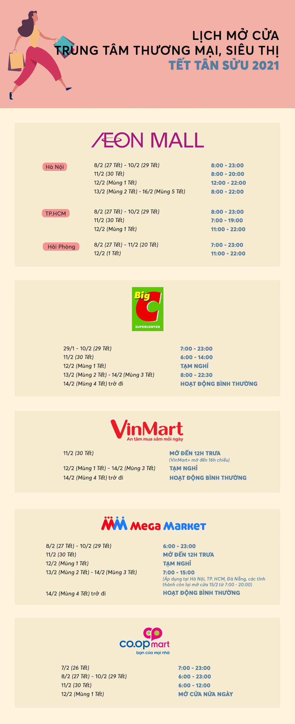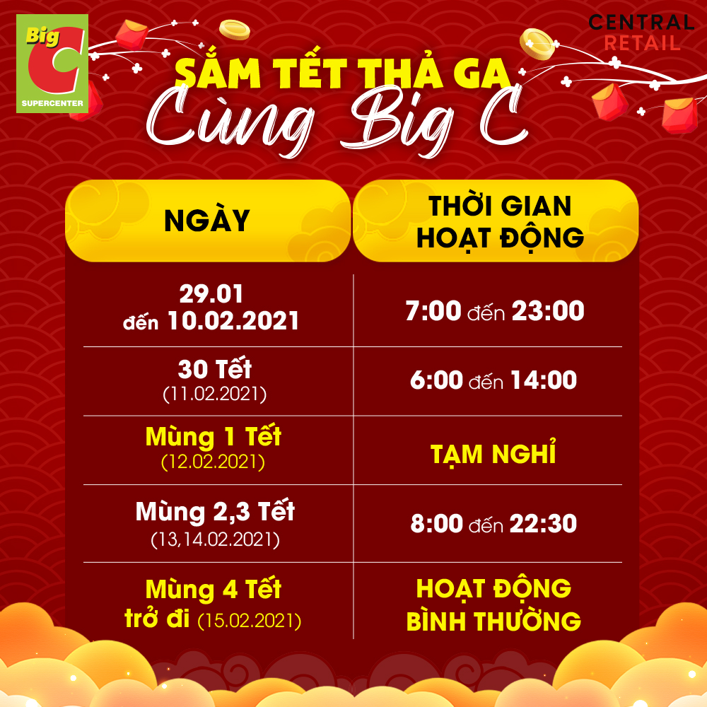 Ngoài ra, nếu bạn có ý định mua sắm trong dịp Tết, các siêu thị Go! và Big C sẽ hoạt động xuyên Tết, chỉ nghỉ mùng 1 âm lịch. Những thông tin này hy vọng sẽ giúp bạn chủ động hơn trong kế hoạch mua sắm Tết của mình!