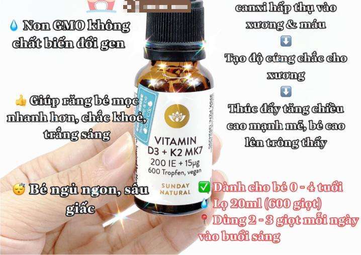 Sản phẩm Vitamin D3 K2 MK7 của Đức, như dòng Sunday Natural, rất được các bậc cha mẹ tin dùng cho trẻ sơ sinh và trẻ nhỏ từ 0 đến 4 tuổi. Nó giúp phòng chống còi xương, dị dạng xương, hỗ trợ phát triển chiều cao và tăng cường hệ miễn dịch cho bé. Ngoài ra, vitamin này còn giúp cải thiện các vấn đề thường gặp ở trẻ như biếng ăn, nôn trớ hay đổ mồ hôi trộm.