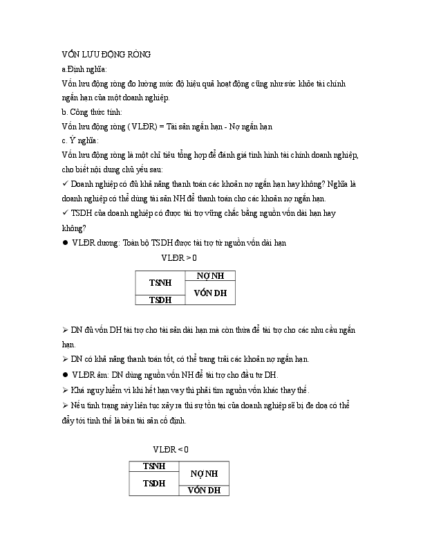Vốn lưu động ròng là chênh lệch giữa tài sản ngắn hạn và nợ ngắn hạn, phản ánh khả năng thanh toán ngắn hạn của doanh nghiệp. Nếu vốn lưu động ròng âm, nợ ngắn hạn lớn hơn tài sản ngắn hạn, tức doanh nghiệp có nguy cơ không đủ tiền mặt để trang trải các khoản phải trả.