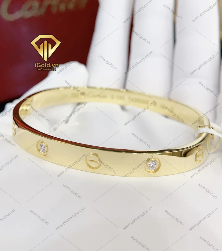 Vòng tay Cartier vàng 18K là một biểu tượng của sự sang trọng và đẳng cấp, được nhiều người yêu thích không chỉ vì thiết kế tinh tế mà còn bởi chất liệu vàng nguyên khối 18K cao cấp. Giá của chiếc vòng này phụ thuộc vào nhiều yếu tố như mẫu mã, trọng lượng vàng và có hay không có kim cương đi kèm. Thông thường, vòng Cartier Love bằng vàng 18K có giá từ khoảng 100 triệu đồng trở lên, thậm chí có thể lên đến vài trăm triệu đồng với những phiên bản đặc biệt hoặc có đính kim cương.