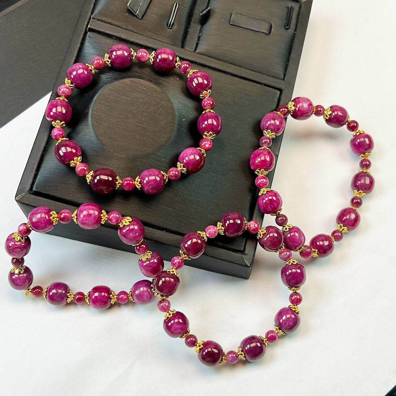 Về mặt phong thủy, đá ruby giúp tăng cường sức khỏe, làm chậm quá trình lão hóa, đặc biệt là với nữ giới, mang lại làn da hồng hào, tươi sáng. Đá ruby có độ cứng cao, chỉ sau kim cương nên rất bền bỉ, ít bị trầy xước, giữ được vẻ đẹp lâu dài. Những chiếc vòng tay thường được làm từ các hạt đá tròn đều, dễ phối hợp với các phụ kiện vàng hoặc bạc, tạo nên vẻ đẹp tinh tế và sang trọng.