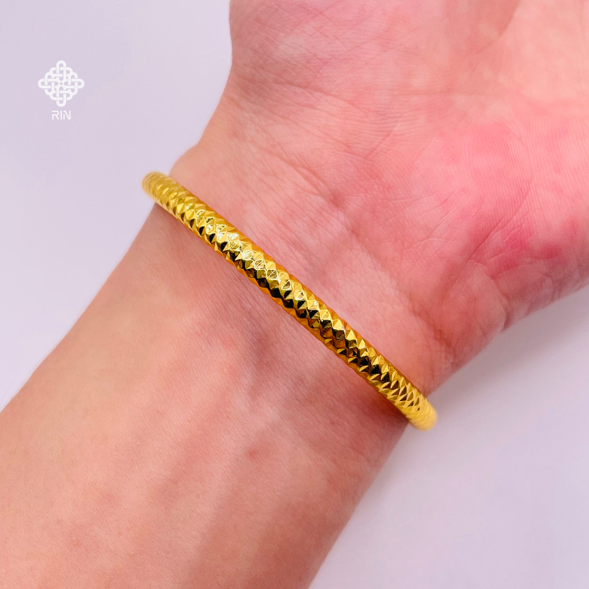 Tuy nhiên, vàng 9999 khá mềm và dễ bị biến dạng khi va chạm, nên thiết kế vòng tay thường ưu tiên kiểu dáng trơn, đơn giản để giữ được độ bền và vẻ đẹp lâu dài. Vòng tay trơn không chỉ dễ phối đồ mà còn tôn lên nét thanh lịch, hiện đại cho người đeo. Đặc biệt, những đường nét mềm mại trên vòng tay vàng 9999 giúp khẳng định phong cách và cá tính tinh tế của phái nữ.