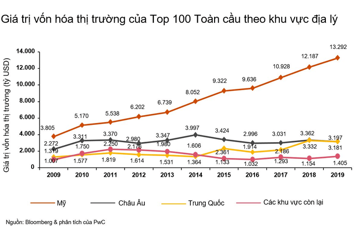 Ngoài ra, các tên tuổi như Amazon, Alphabet (Google), Tesla hay Saudi Aramco cũng góp mặt trong top 10, phản ánh sự đa dạng ngành nghề từ công nghệ, thương mại điện tử đến dầu khí và năng lượng sạch. Đáng chú ý, các công ty Mỹ chiếm phần lớn vốn hóa toàn cầu, trong khi các doanh nghiệp Trung Quốc đang gặp nhiều thách thức và có xu hướng giảm sút giá trị thị trường.