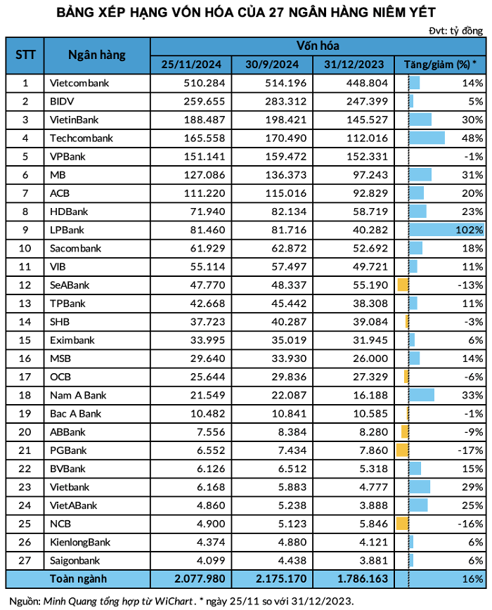 Thị trường vốn hóa năm nay cũng chứng kiến sự thay đổi khi một số cổ phiếu truyền thống như BVH, REE, POW dần rời khỏi Top 30 do kết quả kinh doanh không còn hấp dẫn. Tổng vốn hóa toàn thị trường đạt khoảng 7,2 triệu tỷ đồng, tăng hơn 20% so với năm trước, cho thấy sự phục hồi mạnh mẽ và niềm tin lớn của nhà đầu tư vào các cổ phiếu đầu ngành, nền tảng vững chắc. Đây là bức tranh sinh động về sự cạnh tranh và phát triển bền vững của các doanh nghiệp lớn trên sàn chứng khoán Việt Nam.