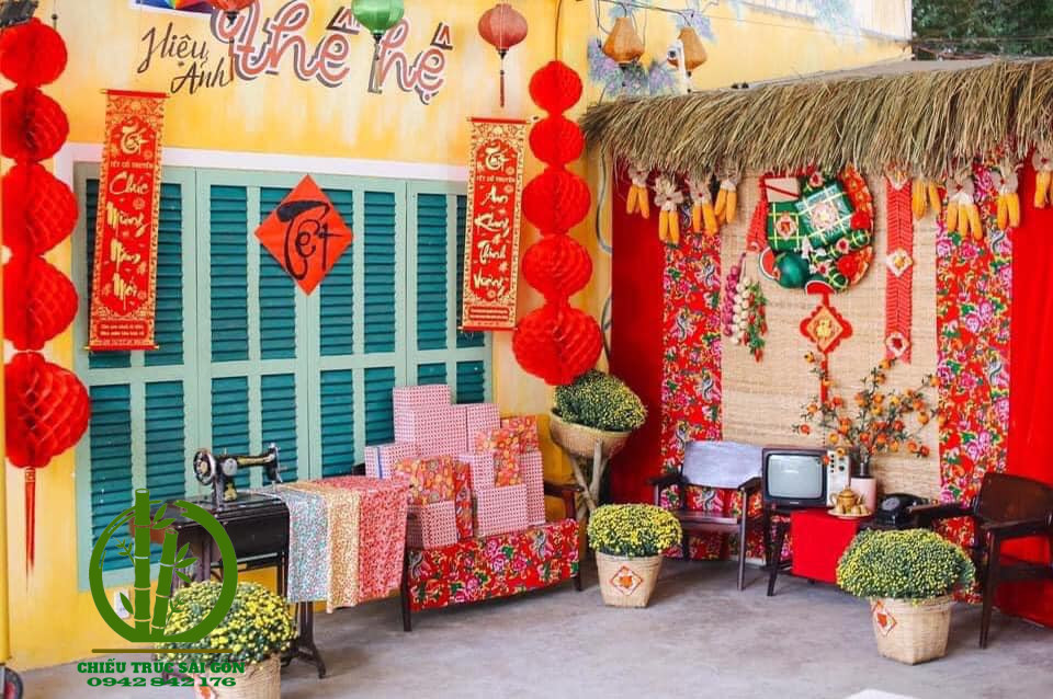 Bên cạnh đó, việc thiết kế tiểu cảnh mành tre kết hợp với mô hình bánh chưng, bánh tét sẽ tạo nên điểm nhấn độc đáo, vừa giữ được nét truyền thống mà vẫn mới mẻ. Vòng hoa Tết cũng là một ý tưởng thú vị để trang trí cho cửa ra vào hay các bức tường ngoài trời, mang lại sự tươi mới và ấm áp cho không gian.