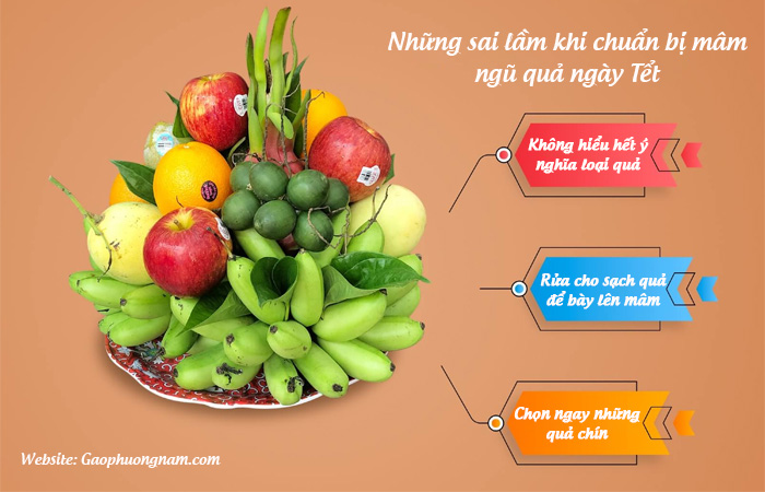 Đặc biệt, cần lưu ý không bày các loại hoa hay thực phẩm khác lên mâm ngũ quả, vì như vậy sẽ làm mất sự trang trọng của mâm, khiến nó trông kém thu hút. Ngoài ra, việc trưng bày trái cây còn ướt cũng là một sai lầm lớn, vì sẽ khiến trái cây nhanh hỏng. Hãy nhớ chọn những quả không có dấu hiệu trầy xước và còn cuống xanh để tạo nên một mâm ngũ quả hoàn hảo.