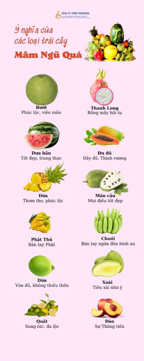 Theo quan niệm xưa, năm loại trái cây đại diện cho ngũ hành: Kim, Thủy, Mộc, Hỏa, Thổ, và cũng tương ứng với năm ước nguyện về Phúc, Lộc, Thọ, An, Khương. Sự kết hợp này không chỉ tạo nên một mâm quả bắt mắt mà còn thể hiện mong muốn cho một năm mới tràn đầy may mắn và tài lộc.
