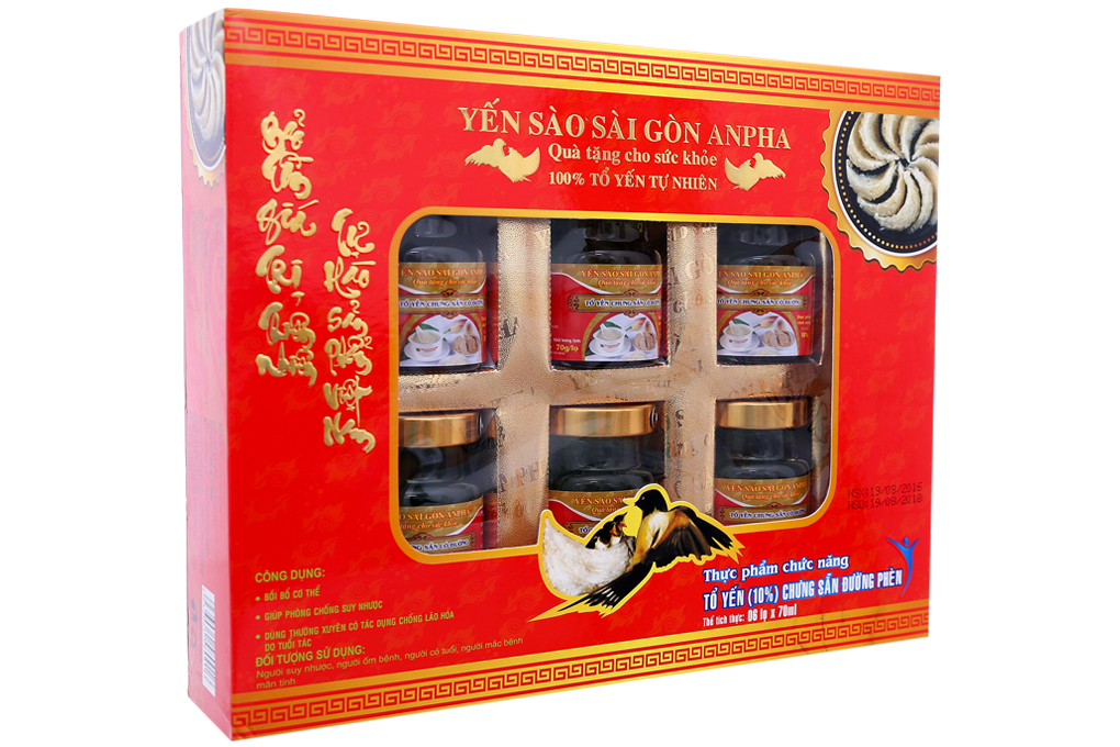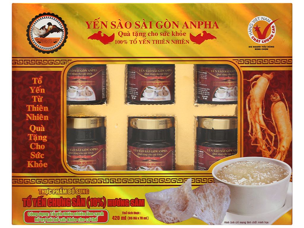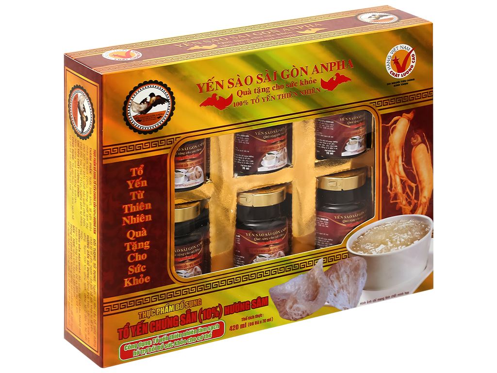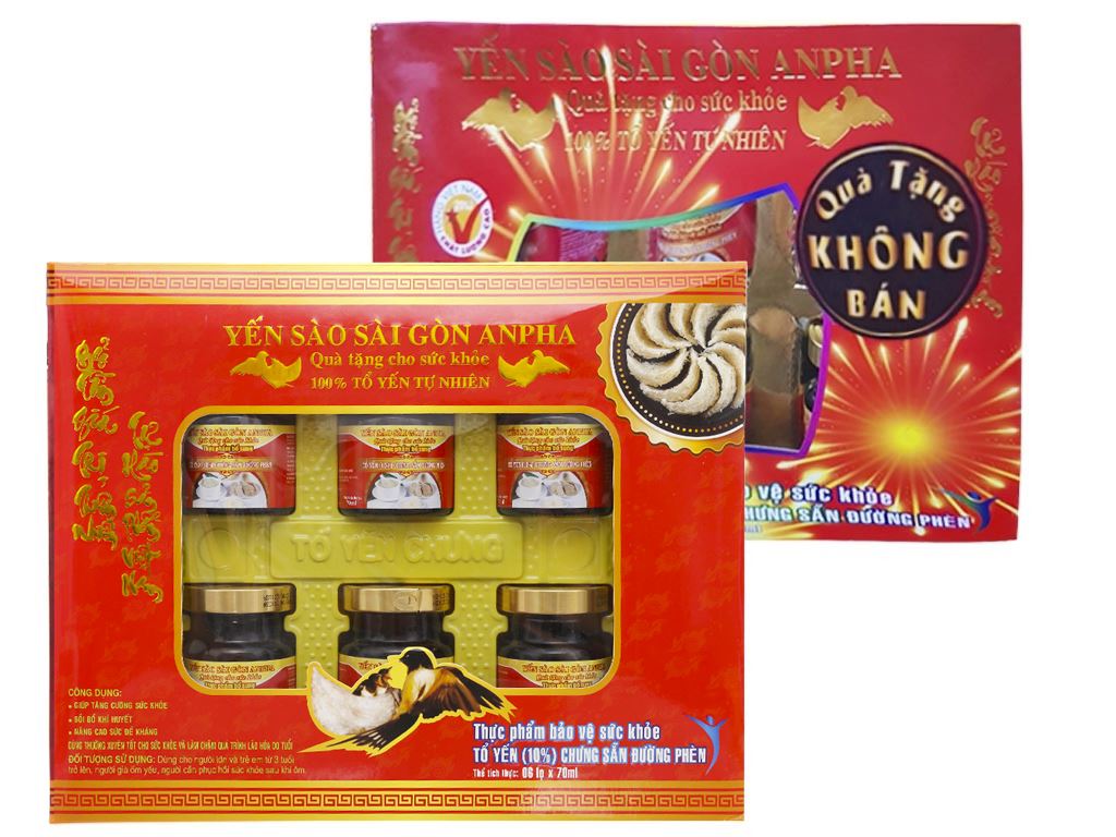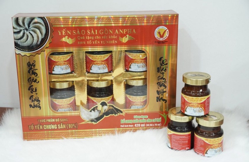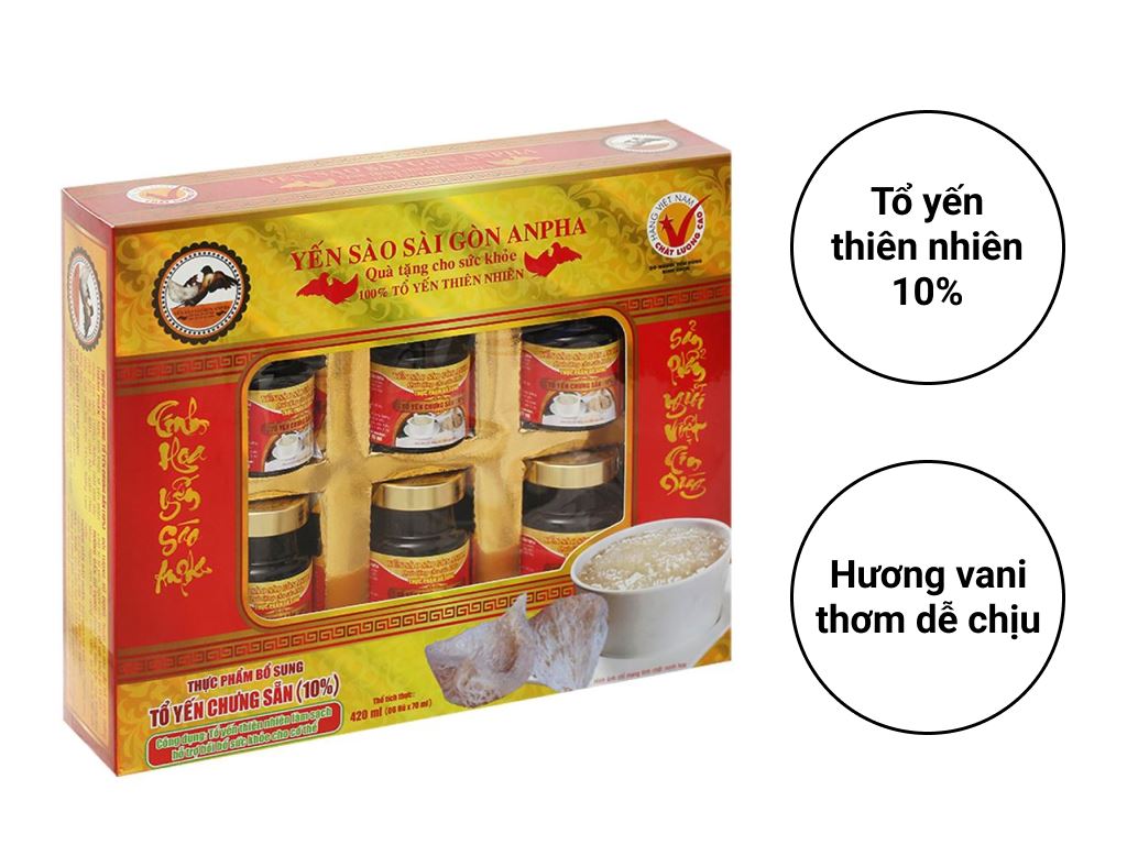 Yến Sào Sài Gòn Anpha là một thương hiệu nổi tiếng tại thành phố Hồ Chí Minh, được nhiều người tiêu dùng tin tưởng. Với sản phẩm tổ yến chưng sẵn có 12% hàm lượng tổ yến, sản phẩm này đặc biệt phù hợp với trẻ em từ 3 tuổi trở lên và cả người lớn. Nhờ hàm lượng chất dinh dưỡng cao, Yến Sào Anpha giúp tăng cường sức khỏe và giảm thiểu nguy cơ mắc các bệnh về đường hô hấp.